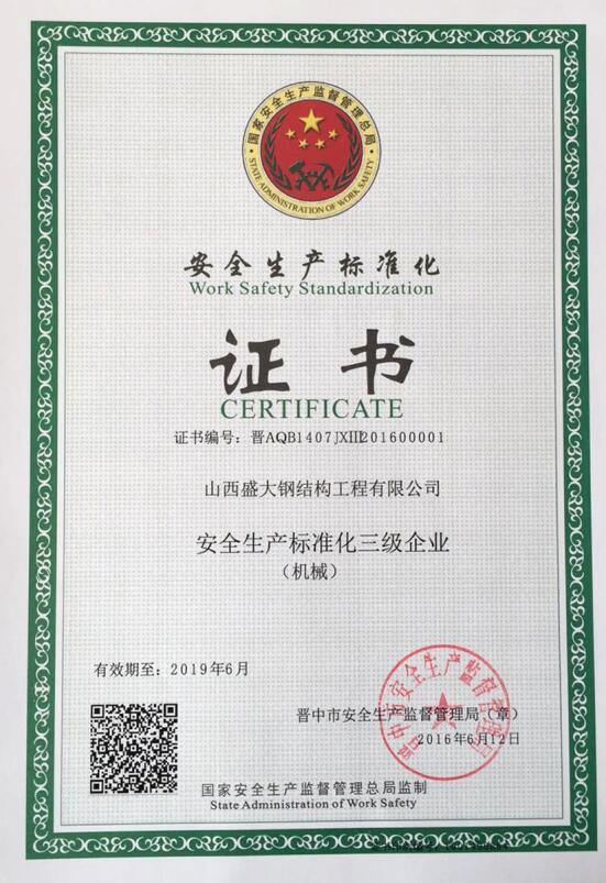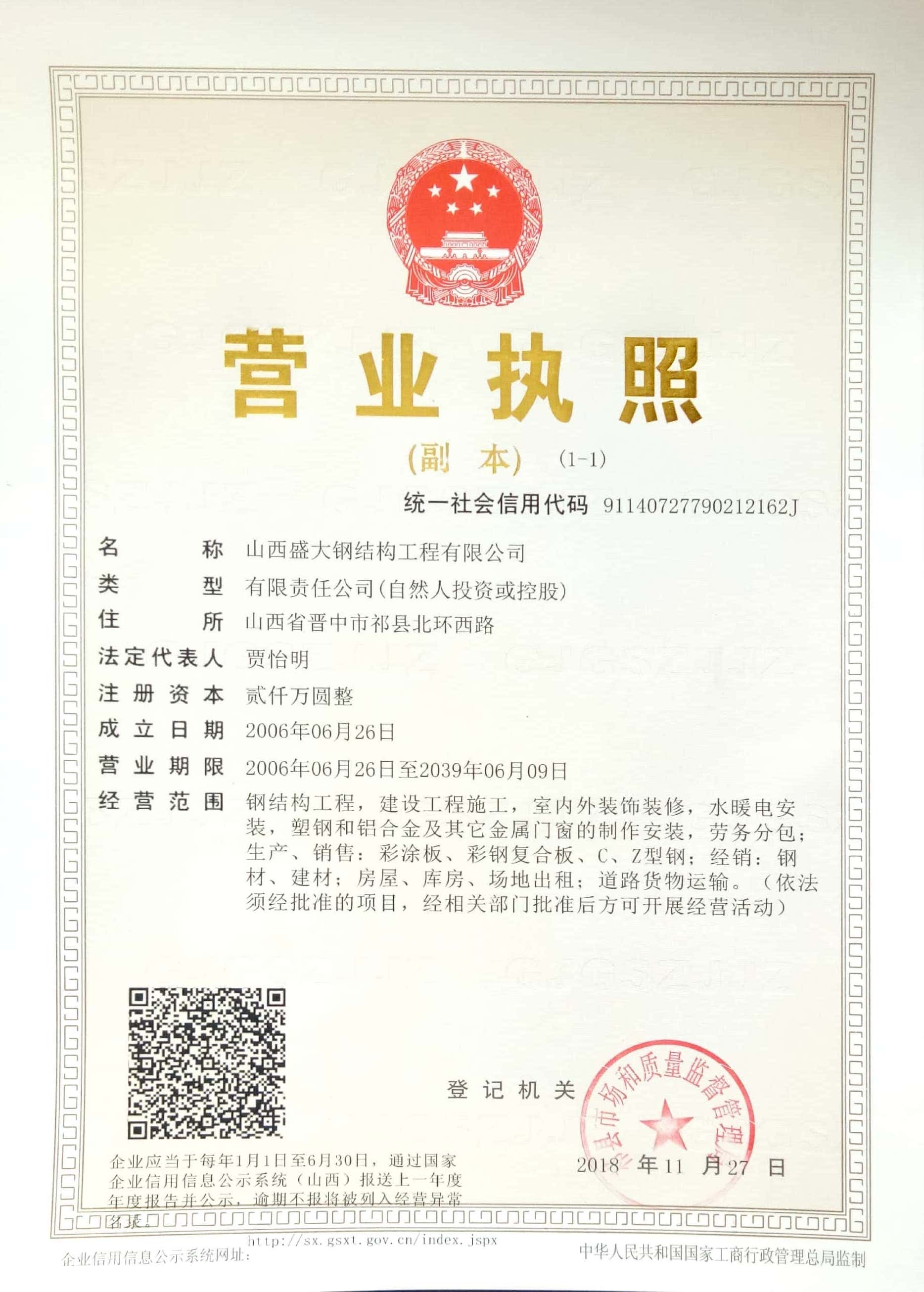 山西盛大鋼結構工程有限公司 山西盛大鋼結構工程有限公司成立于1996年,坐落于國家歷史文化名城——山西祁縣。擁有兩大智能化鋼結構生產(chǎn)基地,占地110畝,建筑面積3萬余平方米,具備鋼結構專業(yè)承包貳級、建筑工程施工總承包貳級資質,是一家集設計、制造、施工于一體的大型鋼結構工程企業(yè)。 盛大鋼構是中國鋼結構協(xié)會會員單位,山西鋼結構協(xié)會副會長單位,山西建筑企業(yè)商會理事單位,山西省土木建筑學會會員單位,擁有國家知識產(chǎn)權局注冊商標。公司已通過ISO9001質量管理體系認證,體系覆蓋鋼結構加工與施工等核心… more +